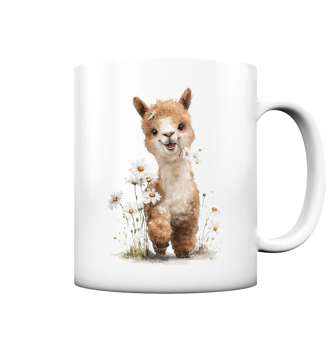 Mit einem niedlichen Alpaka-Motiv und zarten Gänseblümchen verbreitet diese Tasse pure Lebensfreude.